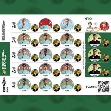 Spielerchips (18 Holzchips, 40 mm Durchmesser) und ein Stickerbogen mit 18 FUTGOAL-Spielern (zum Aufkleben auf die Holzchips)